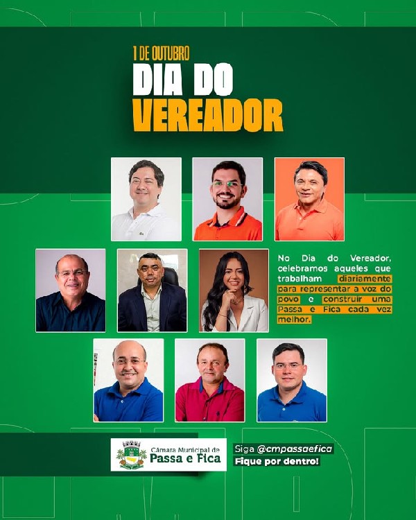 Hoje, dia 01 de outubro de 2025, celebramos o Dia do Vereador! Nesta data especial, queremos parabenizar todos os vereadores que dedicam seu tempo e esforço para representar e lutar pelos interesses da população. Na Câmara Municipal de Passa e Fica, não poderíamos estar mais orgulhosos do trabalho realizado por nossos vereadores, que com comprometimento e dedicação, buscam sempre o melhor para nossa cidade.