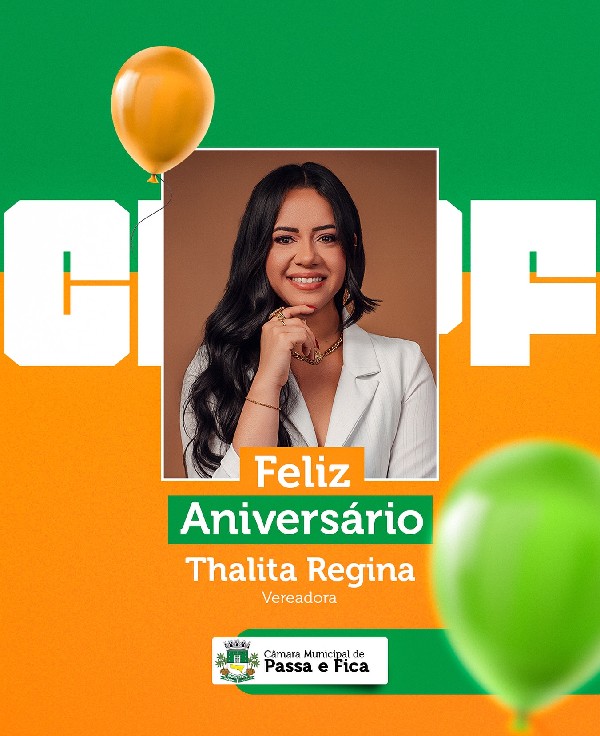 Hoje é um dia especial para a nossa querida Vereadora Thalita Regina, que está completando mais um ano de vida! Em nome de toda a equipe da Câmara Municipal de Passa e Fica, queremos desejar a ela um feliz aniversário repleto de alegrias, saúde e sucesso. Thalita Regina tem se destacado pelo seu comprometimento e dedicação em representar o povo da nossa cidade, sempre pautando suas ações pela ética e responsabilidade. Que essa data seja celebrada com muita felicidade e que sua jornada como Vereadora seja cada vez mais brilhante e repleta de conquistas. Parabéns, Thalita Regina, que sua luz continue iluminando o caminho de todos nós!